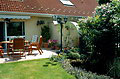 Terv: 1997, elkészült: 1997Telekterület: 630 m2 2005-ben Az Év Kertje Kiemelt Különdíj-ját kapta A fantáziának nem szab határt sem a kerítés, sem a telekméret. Egy ikerház kisebb alapterületű kertjét is többféleképpen lehet kialakítani, az igények, az elképzelések és nem utolsó sorban a pénztárca függvényében. Már nyolc éve, hogy a tulajdonosok lakótelepi panellakásukból ebbe az ikerházba költöztek. Az épület kialakításakor, a jobb helykihasználás érdekében, alagsori szintet is terveztek a házba, ami miatt a nappali szintje jóval a környező terep fölé emelkedett így a belső tér és a kert között nem volt közvetlen kapcsolat. A kitermelt földből ezért egy domb épült a nappali mellé, így most lépcsők nélküli, egyenletesen lejtő gyepszőnyeg vezet az eredeti terepszinten kialakított alsó, hátsó, illetve oldalsó kertrészébe. Ezáltal a nappali, a terasz és a kert egybefüggő teret alkot, megvalósítva a külső és belső tér egységét. Ezt az egybefüggő teret, különálló, intim zugok szakítják meg. A téglalap alakú kerthez a közelmúltban még egy részt csatoltak, így „L” alakú telek lett belőle. Az újonnan a telekhez csatolt kertrész végleges kialakítása, a közeljövő feladata. A tervek szerint a két telek közé a szomszédot eltakaró tűlevelű sövényt, a kertnek erdei hangulatot kölcsönző lombos fák ültetését tervezik. Az „L” alak rövidebb szárában gyümölcsfák élnek. Az „új” és régi kert határán található a tűzrakó-hely, ami egy pihenőhöz kapcsolódik. Ez utóbbi burkolata fakocka, amit a háziak maguk vágattak 10x10 cm-es akácgerendákból. A pihenő felett nádfedelű hintaágy hívogatja a látogatót. Ennek közelében került kialakításra a „gyereksarok”. Az évek múlásával e terület funkciója változni fog, de a legkisebb csemete egyelőre élvezi az itteni játékot, így az átalakítás még várat magára. A teraszhoz kapcsolódó fóliás kerti tó rengeteg madarat vonz. Magán a teraszon mediterrán hangulat uralkodik a dézsákban élő fagyérzékeny növényeknek, és a falra szerelt kaspókba ültetett színes virágoknak köszönhetően, melyek a téli hónapokat a pincében vészelik át. A nappali szintje, a terasz burkolata és az oldalkertben lévő bejárat közötti szintkülönbség ideális hely volt egy sziklakert építésére. A kövek között élő, különböző nagyságú, színű és formájú örökzöldek képezik a sziklakert vázát, ezt egészítik ki a színes virágú évelők, talajtakarók. Ez a rész a háziasszony „kísérleti üzeme”, ahová a tervtől eltérően egyéb, a tulajdonosoknak is tetsző növényeket ültettek. »
